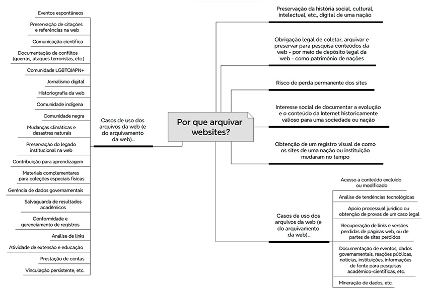 Os casos de uso associados aos arquivos da web podem similarmente fornecer inúmeros motivos para arquivar páginas web que documentam tanto eventos recentes, dados governamentais, reações públicas, notícias históricas, instituições culturais, informações de fonte para pesquisas acadêmico-científicas quanto uma ampla diversidade de tópicos, com conteúdo produzido em várias nações, em diferentes idiomas e plataformas (sites, blogs, mídias sociais etc.).
