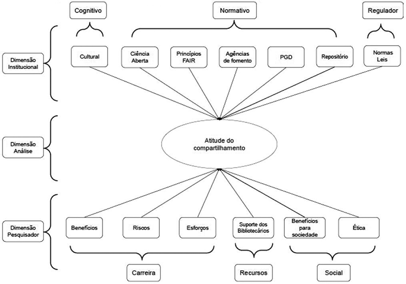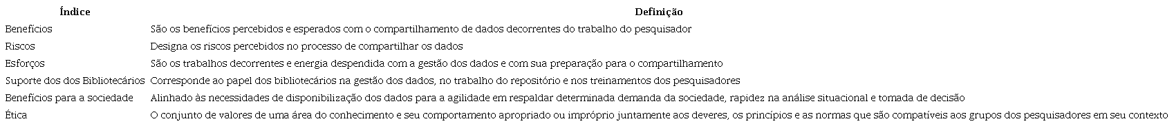 A seleção e delimitação dos índices e categorias foi amparada pela Teoria Institucional (TI) de Scott (1995), Teoria do Comportamento Planejado de Ajzen (1991) e no Modelo de pesquisa de comportamento de compartilhamento de dados de Kim (2017), sendo o último estruturado para fatores que influenciam o comportamento dos cientistas que compartilham dados por meio de repositórios de dados. Dito isso, o autor afirma que “[...] as pressões institucionais, motivações individuais e recursos afetam os diversos comportamentos de compartilhamento de dados dos cientistas [...]” ( KIM, 2017, p. 879).