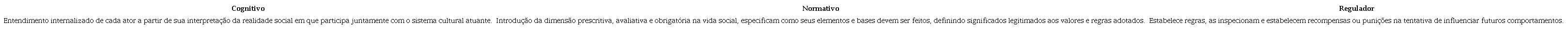 A Dimensão Institucional é fundamentada na Teoria Institucional que advém de estudos sociológicos e organizacionais e contribui para a conexão entre diferentes fatores que incluem instituições, infraestrutura e pessoas, além de examinar como os atores executam comportamentos aceitáveis para serem legitimados diante das pressões institucionais ( KIM, 2017; SCOTT, 1995). A Teoria Institucional contempla três pilares: Cognitivo, Normativo e Regulador ( SCOTT, 1995) que serviram para delimitar as categorias do framework e organizar os índices selecionados para análise. Os três pilares estão descritos no quadro 1.
