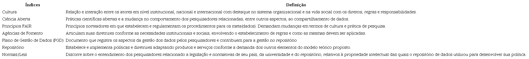 Conforme ilustrado no Framework, as categorias são: Cognitivo com seu índice Cultura; Normativo com seus índices Ciência Aberta, Princípios FAIR, Agências de fomento, Plano de Gestão de Dados (PGD) e Repositórios; Regulador com seu índice Normas e Leis. Os índices e suas definições estão no quadro 2.