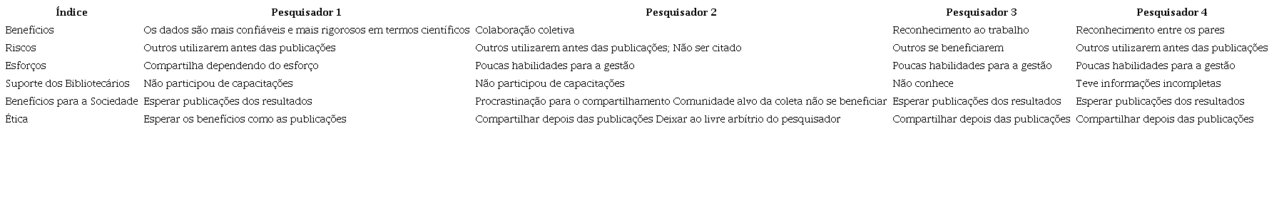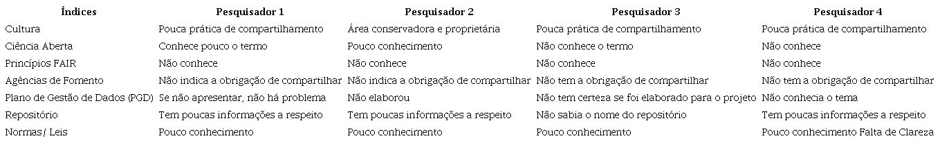 No quadro 3 são apresentados os aspectos identificados nas respostas dos pesquisadores participantes da pesquisa sobre as temáticas identificadas pelos índices e que estão relacionadas ao compartilhamento dos dados. As respostas mais relevantes dos pesquisadores são apresentadas e discutidas na sequência.