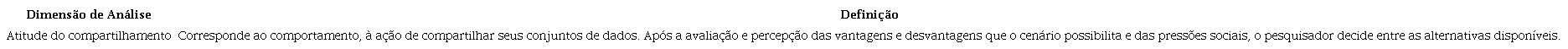 A Dimensão Análise está centrada no compartilhamento do pesquisador. A Dimensão é baseada na Teoria do Comportamento Planejado (TCP) “[...] uma teoria projetada para prever e explicar o comportamento humano em contextos específicos [...]” com fator centrar em que há “[...] a intenção do indivíduo em executar um determinado comportamento.” ( AJZEN, 1991, p. 181, tradução nossa).