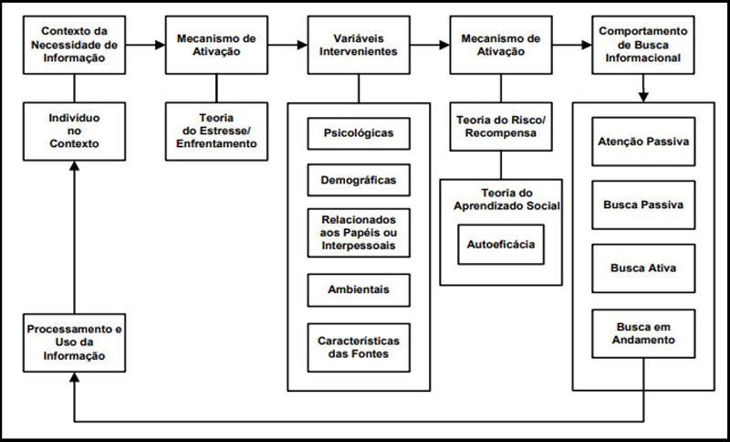 Adiante, é perceptível a existência de outra fase, que faz uso de conceitos da “Teoria do Risco/Recompensa”, mostrando por que algumas fontes de informação são mais usadas do que outras, consequências de desencadeamentos oriundos das variáveis intervenientes. Já a “Teoria do aprendizado social” atrela-se às razões de algumas pessoas perseguirem a busca informacional com sucesso e outras não, baseada na própria percepção de autoeficácia. Para Wilson (1999), uma pessoa, mesmo ciente da utilidade de uma fonte de informação, pode falhar no uso dela se estiver insegura sobre sua capacidade de lidar com essa fonte. Enfim, são evidenciados diferentes tipos de busca de informação para que, então, se estabeleçam seus processamentos e usos.