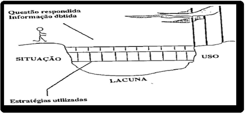 Dervin (1992) também se esforçou na construção de um modelo de comportamento informacional, partindo do pressuposto de que o indivíduo seria constituído por um quadro interno de referências, formado por significados interiorizados a partir de observações da realidade. Ao confrontar-se com a vida, entretanto, o sujeito depara-se com desordens que causam descontinuidades em sua existência. Para vencer essas descontinuidades, ele lança mão de seus quadros de referências, todavia, quando estes não permitem transpor os obstáculos, um processo de busca informacional apresenta-se necessário. Em resumo, a abordagem oferece uma metáfora ( Figura 2), na qual a necessidade informacional é comparada com uma lacuna e, através da busca (ponte), responde-se à questão principal, transpondo o vazio percebido.