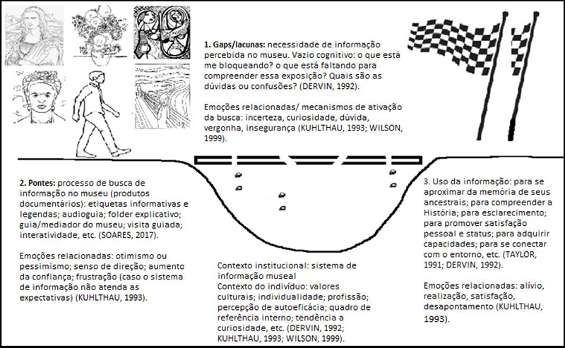 A Figura 3, nesse sentido, exemplifica o processo de necessidade, busca e uso de informação pelo usuário do museu, abarcando as principais correlações realizadas com os modelos estudados. A “ponte”, ou seja, as formas de transpor o vazio cognitivo, encontra-se com ranhuras, uma vez que, nem sempre, o processo de obtenção de informação pelo usuário visitante dessas instituições é verdadeiramente satisfeito ( IBRAM, 2012; GOMES, 2016; SOARES, 2017).