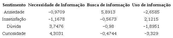 Prosseguindo para as relações emocionais no processo de percepção de necessidade, busca e uso de informação nos museus (questões 13, 14 e 15), a Tabela 1 traz uma análise estatística das emoções mais citadas pelos usuários invisibilizados, mostrando que quão mais alto o valor resultante da análise, maior o cálculo de frequência da palavra citada pelos entrevistados em relação a cada atributo estudado (necessidade, busca ou uso de informação).