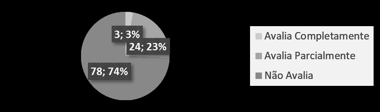 No gráfico a seguir, é possível observar que, dos 105 indicadores avaliados nesta pesquisa, 78 (74%) não são avaliados pelas fontes, enquanto 24 (23%) são avaliados de forma parcial. Por fim, apenas três (3%) avaliam diretamente o indicador.
