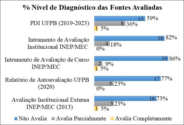Inicialmente, percebemos que a UFPB possui uma estrutura de avaliações internas e externas, e que as bibliotecas possuem espaço em todos os instrumentos, bem como no planejamento da instituição, o que demonstra que há uma preocupação com esses espaços. Na avaliação dos documentos, adotamos conceitos para classificar a análise das fontes: Avalia Completamente, Avalia Parcialmente e Não Avalia. Ao total, foram sugeridos 21 indicadores nomeados como subcategorias, e avaliamos cada um deles nas cinco fontes analisadas, totalizando então 105 análises feitas - sendo 21 em cada fonte.