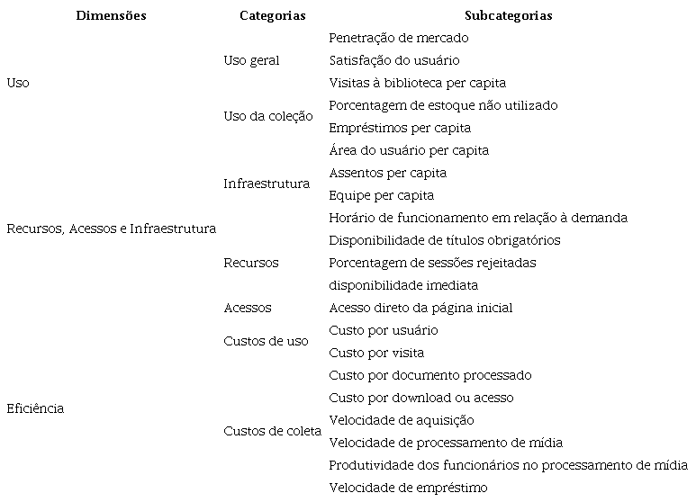 Buscamos, nesta dimensão, através de suas categorias, os indicadores cujos resultados possam proporcionar estratégias de adequação dos recursos e serviços das bibliotecas como um todo, ou seja, equipe, coleções, serviços, infraestrutura. Sendo assim, é uma das categorias mais importantes do estudo.