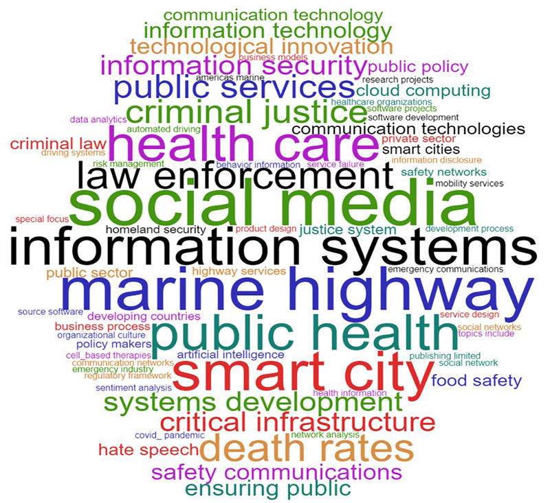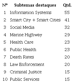 As expressões public safety e public security não foram consideradas na elaboração da nuvem de palavras uma vez que já estão expressas na sintaxe de pesquisa, razão pela qual foram retiradas da figura acima. Algo que vale destacar na análise da nuvem é a elevada frequência das expressões Smart City (27) e Smart Cities (14), que juntas aparecem em um total de 41 vezes, configurando, dessa forma, o segundo subtema mais presente nos trabalhos científicos, ficando atrás apenas de Information Systems (55).