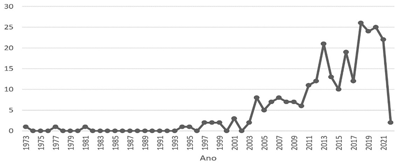 Considerando o quantitativo global de trabalhos, o tema, que começou a se desenvolver na década de 1970, atingiu seu ápice em 2018 quando foi alvo de 26 publicações. No último triênio (2019-2021), contudo, houve declínio no número de publicações. Veja-se a distribuição temporal das pesquisas no gráfico 1 que se segue.