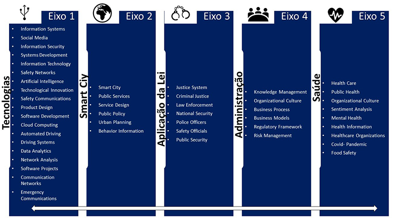 Pelo eixo da ocupação territorial (E2), discute-se a segurança pública no campo das cidades inteligentes e da sustentabilidade. No eixo da aplicação da lei (E3), os subtemas compreendem os sistemas de justiça, penitenciários, de persecução criminal, bem como aspectos ligados aos seus agentes e à prestação de serviços públicos específicos. No eixo administrativo (E4), agrupam-se temas ligados à gestão e à governança da segurança pública, seus processos e suas modelagens. Por último, no eixo saúde (E5), discute-se a saúde física e emocional, tanto de indivíduos quanto de grupos, através de assuntos que perpassam desde a Covid-19 e saúde mental até questões estruturais como sistemas de cuidados em saúde.