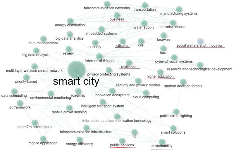 Observando a figura 3 abaixo é possível perceber que o eixo 02, em que se encontram as smart cities, é tratado sob um forte viés tecnológico, mas que também aborda, embora perifericamente, subtemas de base como resiliência, educação, bem estar social e sustentabilidade.