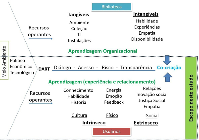 No contexto específico, estão relacionados aos recursos operantes dos participantes, e o meio ambiente onde ocorrem a co-criação de valor. Os recursos operantes de bibliotecas foram descritos por Islam, Argawal e Ikeda (2015), Golooba (2017), Siddike, Unemoto e Koda (2014), Baron e Warnaby (2011). Já os recursos referentes ao usuário, foram encontrados nos estudos de Baron e Warnaby (2011), Siddike, Unemoto e Koda (2014) e Golooba (2017). Baron e Warnaby (2011), acreditam que o ambiente (político, econômico e tecnológico) é fator relevante ao analisar os processos de co-criação de valor.