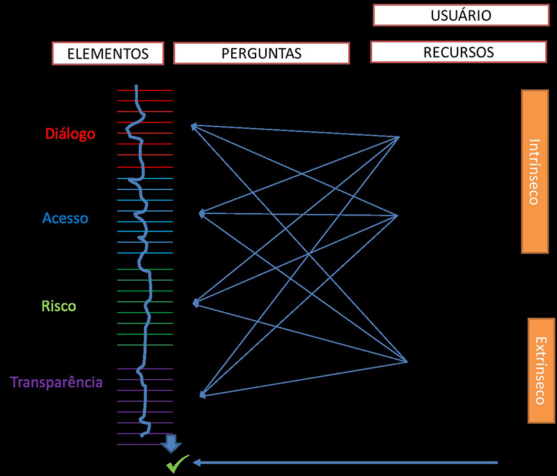 O quadro de referência comporta os estudos e delineamentos teóricos (o portfólio bibliográfico pesquisado), a formulação da estrutura teórica (figura 1) e a estratégia para análise dos dados do usuário (figura 2). Sua estrutura é dividida em quatro seções, (diálogo, acesso, risco e transparência) que são os elementos DART. Em cada seção foram distintos os aspectos (intrínseco e extrínseco) do usuário, sendo que, em cada um deles, foram delimitados os recursos operantes condizentes com o aspecto.