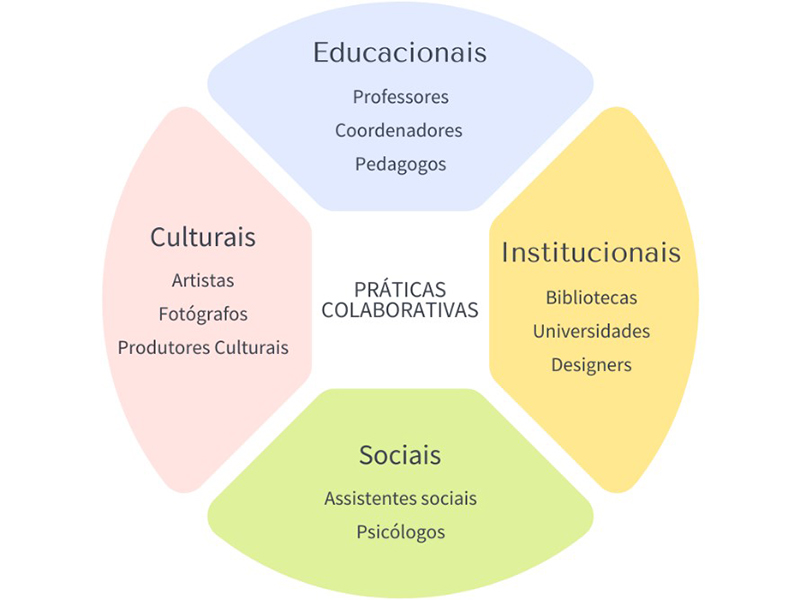 A primeira envolve atores educacionais, tais como professores, coordenadores e pedagogos, sendo representado principalmente pelas ações promovidas em bibliotecas escolares e universitárias, mas que podem também se estender a todas as demais, visto que a competência em informação também se apresenta como um processo de ensino e de aprendizagem. A segunda concerne às parcerias com atores culturais, como artistas, fotógrafos e produtores, que auxiliam os bibliotecários a abordar temáticas sensíveis e criativas, assim como aspectos próprios da dimensão estética da competência em informação. Cabe relembrar que a dimensão estética diz respeito a uma das quatro dimensões da competência em informação proposta por Vitorino e Piantola (2009), e refere-se à sensibilidade, à criatividade e à harmonia, sendo essencial no que concerne à subjetividade humana e, portanto, relevante no desenvolvimento humano.