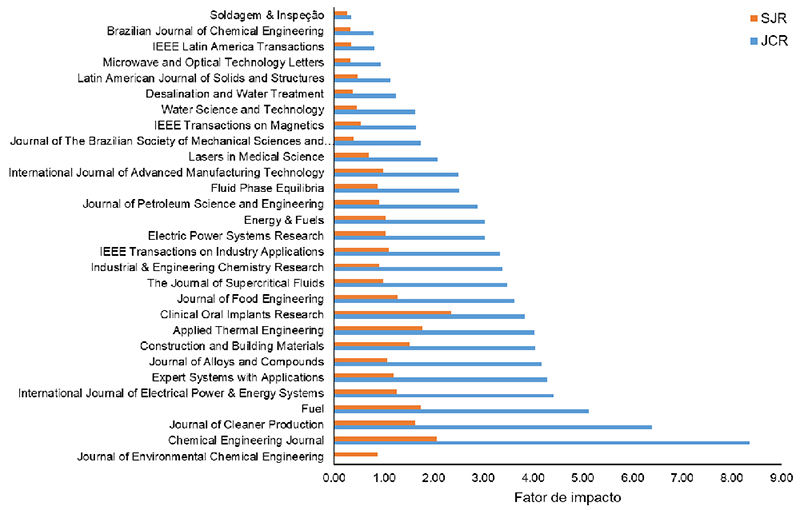 Quanto ao fator de impacto JCR ou SJR. O Journal of the Brazilian Society of Mechanical Sciences and Engineering está na 20ª e 24ª posição no ranking JCR e SJR, com fator de impacto de 1,743 e 0,393, respectivamente. O Brazilian Journal of Chemical Engineering está em 27ª posição em ambos os rankings, com fator de impacto de 0,790 e 0,318 no JCR e SJR, respectivamente. O periódico Soldagem & Inspeção está na 28ª e 29ª posição, com fator de impacto de 0,329 e 0,268 no JCR e SJR, respectivamente. Por último, o Latin American Journal of Solids and Structures está na 24ª e 22ª posição, com valores de fator de impacto de 1,125 e 0,474 JCR e SJR, respectivamente.