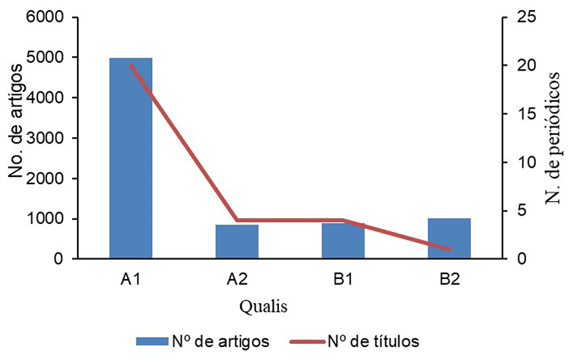 Os resultados demonstram que há 20 títulos com estrato A1 do Qualis CAPES, responsáveis pela publicação de 4.599 artigos, cabe destacar a concentração de artigos nesses títulos. Como a CAPES limita o número de títulos classificados como A1 e estes pontuam mais para os cursos de pós-graduação, é esperado um esforço dos pesquisadores em publicar nestes títulos.