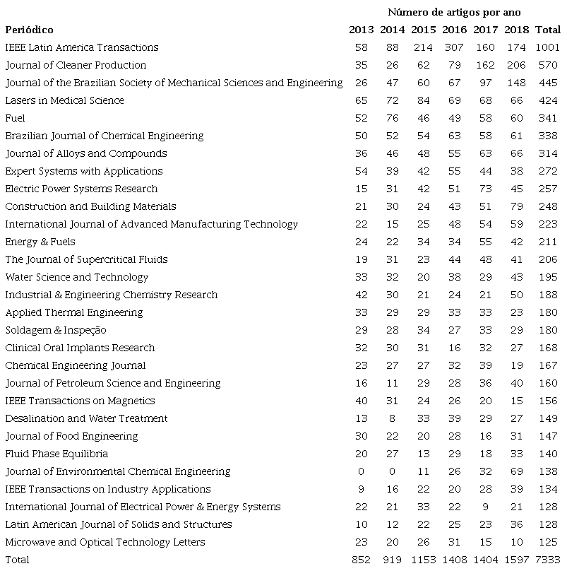 Os três últimos anos tiveram o maior número de publicações: 1.408 em 2016; 1.404 em 2017; e, 1.597 em 2018, levando-se em conta todos os periódicos de núcleo. O IEEE Latin America Transactions teve seu maior número de artigos publicados em 2016 (307), 2017 (160) e 2018 (174), o que representa um decréscimo de 57% de 2016 para 2018. O Journal of Cleaner Production aumentou de 79 artigos no ano de 2016 para 162 (105%) em 2017, e 206 (27%) em 2018. Isso corresponde a um total de 132% de aumento nas publicações realizadas pelo periódico. O Journal of the Brazilian Society of Mechanical Sciences and Engineering passou de 67 publicações no ano de 2016 para 97 (aumento de 44,5%) em 2017. Em 2018, passou a publicar 148 artigos por ano, o que corresponde a um aumento de 52,3% quando comparado com o ano anterior. De uma forma geral, para todos os periódicos de núcleo, a maioria (15 periódicos; 51,7%) apresentou um aumento no número de artigos publicados de 2013 para 2018, com uma média máxima de 166,8 artigos para o IEEE Latin America Transactions e uma média mínima de 20,8 artigos para Microwave and Optical Technology Letters.
