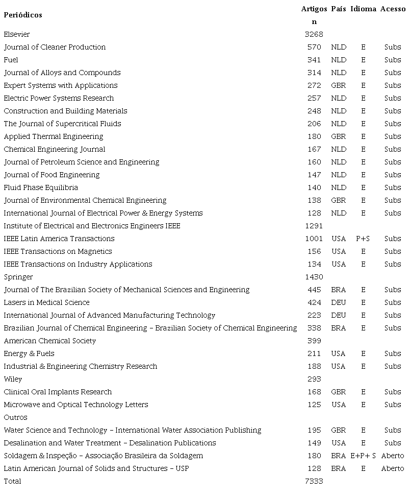 Dos periódicos brasileiros, o Brazilian Journal of Chemical Engineering editado pela Brazilian Society of Chemical Engineering em parceria com a Springer a partir de julho de 2020. Detém estrato Qualis A2 e encontra-se em sexto no ranking de publicações dos periódicos de núcleo das Engenharias com 338 artigos no período, todos no idioma inglês.