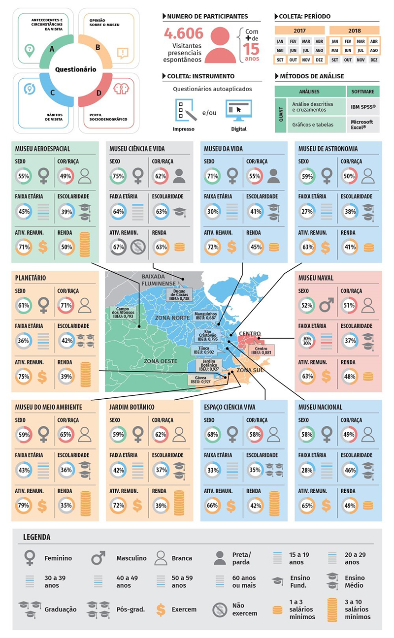 A maioria das visitantes dos nove museus era brasileira (99%) e proveniente da cidade do Rio de Janeiro (67%) e de municípios adjacentes, como Niterói e Duque de Caxias, principalmente. Apenas três instituições se desviaram do padrão. O Museu Ciência e Vida registrou 88% de suas visitantes vindas de Duque de Caxias ou de outras cidades da Baixada Fluminense. O Jardim Botânico é um famoso ponto turístico da cidade do Rio de Janeiro e teve 64% dos respondentes oriundos de fora do Rio de Janeiro, e o Museu do Meio Ambiente, que fica localizado dentro dele, registrou 53% de visitantes também de fora do município. Esse achado está em consonância com o entendimento de “turista padrão”, aquele que não mora na cidade onde o museu está situado. Por outro lado, o “turista cidadão”, prevalente nos outros museus, é aquele que mora ou usufrui da cidade, integrando os fluxos de ideias, comportamentos variados e culturas próprias. Essa capacidade de movimentação transforma os moradores em turistas, que nessa mobilidade, se apoderam de forma mais efetiva dos espaços e situações, em um novo exercício de cidadania ( MORETTONI, 2018).