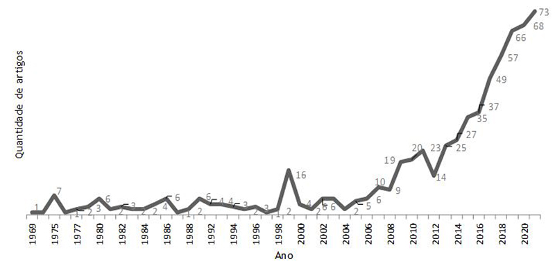 O segundo filtro refere-se ao idioma, em que foram considerados artigos em inglês (71 artigos foram eliminados). O terceiro filtro delimitou o término do período de publicação dos artigos a 2021, que corresponde ao último ano completo até a data de realização desta pesquisa (24 artigos foram eliminados). Após a aplicação dos filtros foi gerada uma matriz de metadados com 647 artigos publicados entre os anos de 1969 a 2021, a qual compõe a amostra tratada e foi utilizada como referência para a condução das análises.