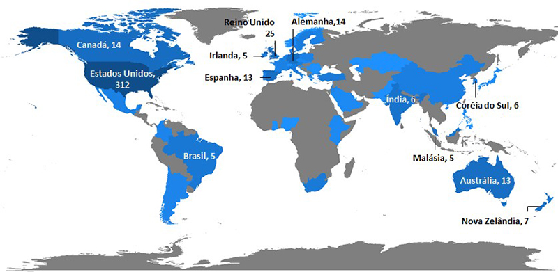 Equivalentemente às informações do Quadro 2, considerando o número de publicações dos autores correspondentes, dentre os dez países que mais produziram cientificamente, os Estados Unidos constam em primeiro lugar, com 312 artigos, seguido do Reino Unido, com 25. O Brasil aparece em décima posição, com cinco artigos. Os demais países da América Latina apontados no mapa mundi, com as respectivas quantidades de artigos, são Chile (dois), Colômbia (dois), Argentina (um) e México (um).