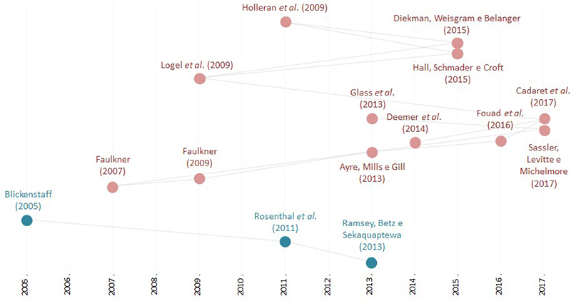 É possível identificar dois caminhos históricos, o primeiro, com início nos tópicos tratados por Blickenstaff (2005), Rosenthal et al. (2011) e Ramsey, Betz e Sekaquaptewa (2013). Por meio de diferentes metodologias, esses artigos adotam, como abordagem comum, ênfase na exploração das especificidades do ensino em STEM para mulheres, para a promoção de um ensino mais inclusivo, propondo implicações sobre políticas e sobre programas educacionais.