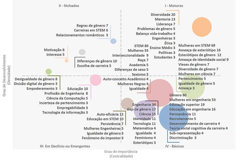 Um cluster entre os quadrantes II e III, que incluiu os termos “Educação”, “Profissão de engenharia” e “Ciência da computação”, caracterizou-se por baixa centralidade e densidade relativa, o que o torna marginal. Os quatro clusters posicionados no quadrante II tratam de tópicos isolados, de alta densidade e baixa centralidade, ou seja, com importância limitada para uma área específica (nichado). Os termos mais frequentes para cada um desses clusters, ordenados em função do grau de desenvolvimento, foram: “Regras de gênero”, “Carreiras STEM”, “Relações românticas”; “Diferenças de gênero”, “Escolha de carreiras”; “Motivação”; “Desigualdade de gênero”, “Divisão digital de gênero”, “Empoderamento”.