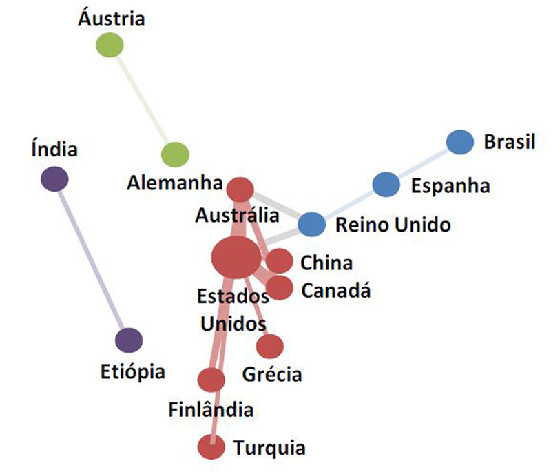 A Figura 6 refere-se à rede de colaboração entre países com pelo menos dois artigos compartilhados. Estados Unidos, Austrália, Canadá e Reino Unido compartilham o maior número de publicações, enquanto os demais países representados na rede possuem uma taxa de colaboração mais baixa. As colaborações da Espanha com o Brasil correspondem aos trabalhos de Spinelli, Germano e Herrera (2019) e García-Holgado, González-González e Peixoto (2020).