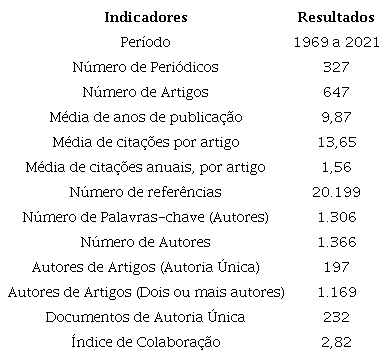 Uma visão geral da amostra tratada é apresentada na Tabela 1. Entre os anos de 1969 e 2021 foram publicados 647 artigos em 327 periódicos diferentes. A relevância dos estudos publicados pode ser percebida pela lenta velocidade com que cada artigo deixa de ser citado (a cada 9,87 anos). A incidência média de citações de cada artigo e as citações anuais por artigo são 13,65 e 1,56, respectivamente.