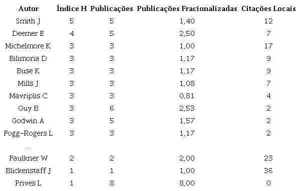 A Tabela 2 identifica, em suas dez linhas iniciais, os dez melhores autores de acordo com o índice H; a respectiva quantidade de artigos publicados; a fração de participação de um pesquisador em cada artigo publicado; e a quantidade total de citações recebidas por pesquisadores no conjunto de artigos da amostra.