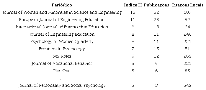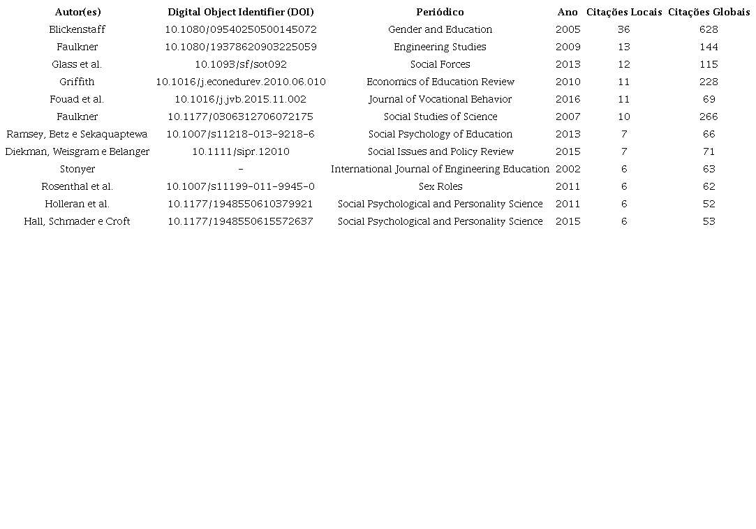 Ainda, quando a métrica é direcionada aos artigos mais citados, de acordo com as informações do Quadro 1, organizado em ordem decrescente de citações locais recebidas, somente três dos melhores periódicos da Tabela 3 são mencionados: Engineering Studies (referente ao artigo com segunda maior quantidade de citações locais), International Journal of Engineering Education (com a nona maior quantidade de citações locais) e Sex Roles (com a décima maior quantidade de citações locais).