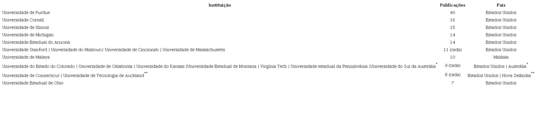 É possível constatar que a grande maioria são universidades norte-americanas, com exceção da Universidade de Malaya, da Malásia (Ásia), Universidade do Sul da Austrália e Universidade de Tecnologia de Auckland, ambas da Oceania. A instituição que mantém a maior quantidade de artigos publicados ao longo do tempo é a Universidade de Purdue, com um total de quarenta. Do conjunto geral de instituições, a única instituição de pesquisadores brasileiros entre as cem primeiras colocações é a Universidade Federal da Bahia, com três contribuições.