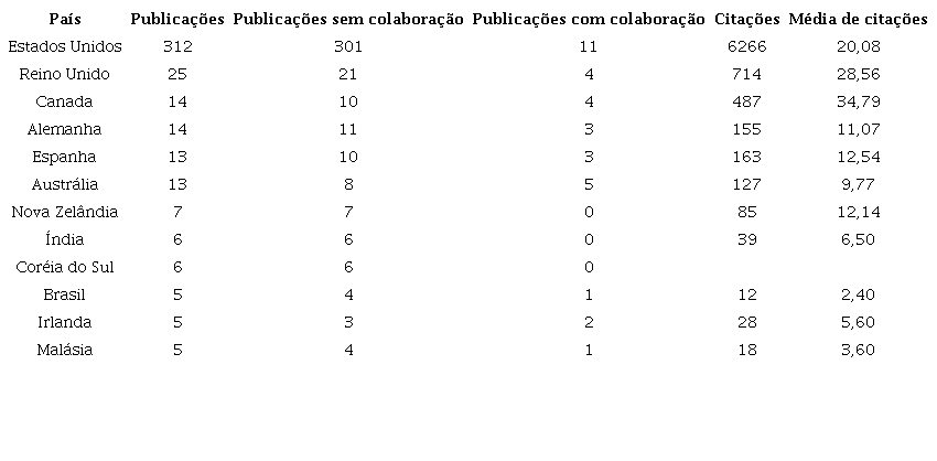 A Tabela 4 detalha os indicadores mensurados para os países destacados na Figura 3. Considerando as médias de citações apresentadas verifica-se que, apesar de os Estados Unidos serem o país com mais publicações, não é o país com o melhor indicador. Artigos com autorias canadense e britânica receberam em média, 34,79 e 28,56 citações, respectivamente, frente a 20,08 citações para artigos norte-americanos.