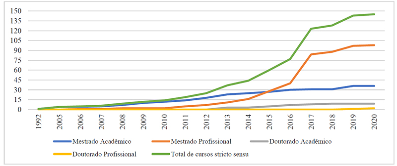 Os programas com maior quantitativo de cursos são o Mestrado profissional e o Mestrado acadêmico, que registraram, em 2020, 98 e 36 cursos, respectivamente, enquanto o Doutorado acadêmico e o Doutorado profissional compreenderam menor quantitativo de cursos, com nove e dois registros, nessa ordem, no mesmo ano. O destaque do programa de Mestrado profissional, com relação ao número de cursos ofertados, também pode ser explicado a partir da formação dos IFs, já que o principal objetivo destes é a profissionalização e, diante disso, a existência de cursos stricto sensu na modalidade profissional torna-se relevante (PACHECO, 2010).