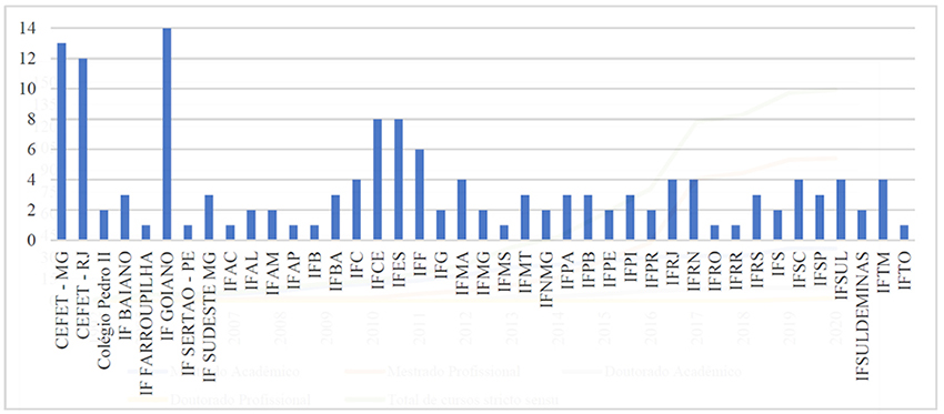 É possível constatar uma evolução, ao longo dos anos, do número de cursos de pós-graduação stricto sensu existentes na RFEPCT, evolução essa que se acentuou, principalmente, a partir do ano de 2010. Tal aumento pode ser associado à criação dos IFs em 2008, visto que, como traz a própria legislação, entre os objetivos atribuídos a essas instituições está o de ofertar cursos de pós-graduação stricto sensu de mestrado e doutorado.