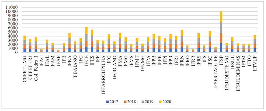 Ainda no que diz respeito à pós-graduação stricto sensu, o Gráfico 3 evidencia o número de docentes da RFEPCT formados nesse nível, por instituição de ensino, de 2017 a 2020, a partir de dados coletados na PNP.