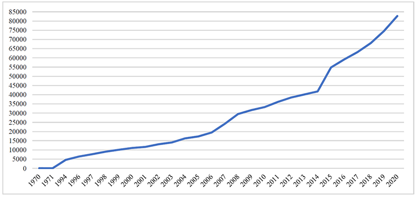 A partir da análise dos dados encontrados na plataforma WoS, foi possível identificar o número de artigos científicos publicados pela RFEPCT, por ano, no período entre 1970 e 2020, conforme o Gráfico 5, a seguir.