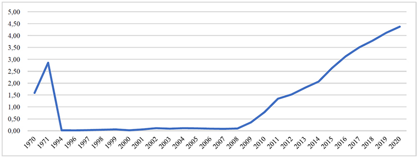 O Gráfico 6 e o Gráfico 7, apresentados na sequência, evidenciam, respectivamente, o número de artigos científicos publicados pelo Brasil, por ano, no período entre 1970 e 2020, e os índices de representatividade das publicações da RFEPCT, no total de publicações realizadas pelo país, no mesmo período.