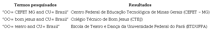 Ressalta-se que parte das instituições pertencentes à RFEPCT não foi localizada na busca por afiliações, como observado no Quadro 1. Desse modo, as mesmas foram pesquisadas diretamente no campo “Visualização de busca”, tendo sido encontradas as seguintes instituições: Centro Federal de Educação Tecnológica de Minas Gerais (CEFET - MG), Colégio Técnico de Bom Jesus (CTBJ) e Escola de Teatro e Dança da Universidade Federal do Pará (ETDUFPA). Os termos utilizados para encontrá-las estão apresentados no Quadro 2.