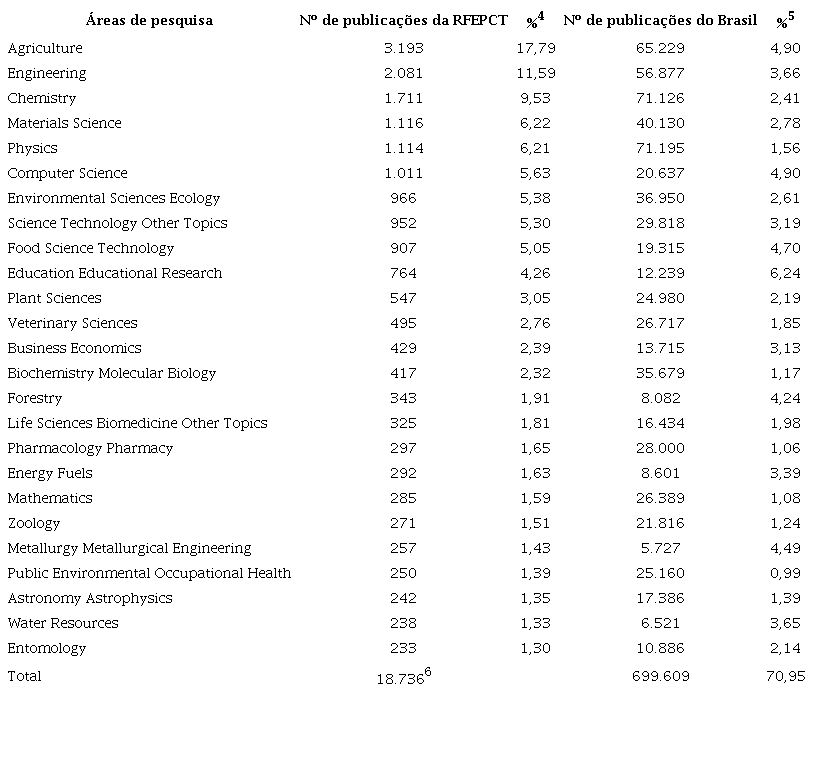 Foram identificadas as 25 áreas de pesquisa que alcançaram maiores números de publicações pela RFEPCT. A Tabela 3, a seguir, evidencia essas áreas e compara o quantitativo de documentos publicados pela RFEPCT e pelo Brasil em periódicos indexados na WoS.