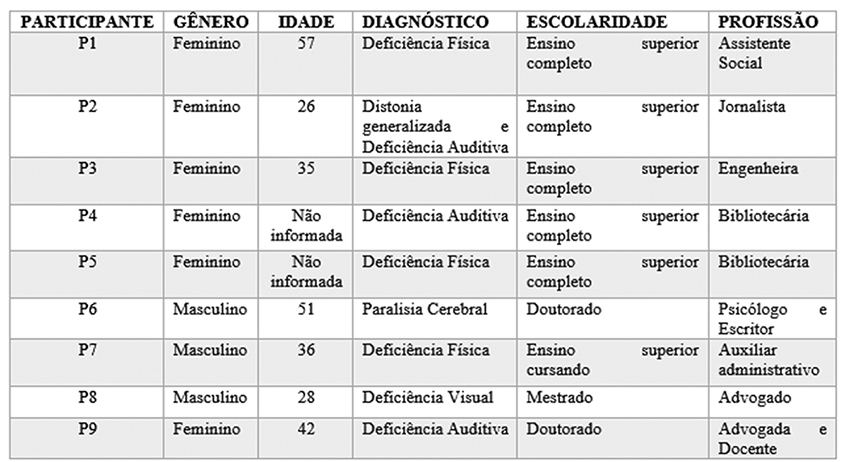 A deficiência física de P1 e P5 deve-se à Poliomielite, por isso P1 faz uso de cadeira de rodas e P5 utiliza muleta canadense, às vezes utiliza também a cadeira de rodas. P3 e P7 possuem deficiência física adquirida por causa de um acidente de trânsito e acidente de trabalho, respectivamente, e, embora ambos utilizem prótese, P3 também utiliza cadeira de rodas. A deficiência de P8 e P9 desenvolveu-se ao longo da adolescência e agravou-se no decorrer dos anos. P4 e P9 utilizam aparelho auditivo e são oralizadas.