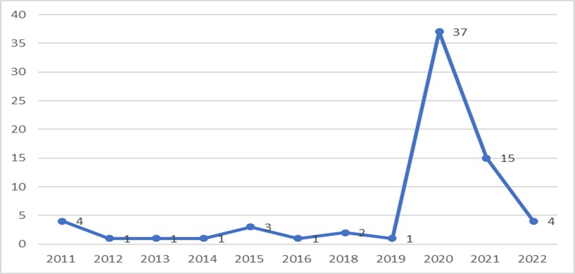 Reitera-se que as três referidas bibliotecas apresentam nos sites o canal no YouTube. Portanto, é preciso deixar visível que a biblioteca possui canal, por exemplo, divulgando no site da biblioteca, por e-mail e relacionando o link com outras mídias. Com a finalidade de analisar os vídeos mais populares em cada canal, foram listados os cinco vídeos com mais visualizações, respectivamente, totalizando 70 vídeos (tabela 2). Observa-se no Gráfico 1 que o ano de maior fluxo de publicações dos vídeos nos canais analisados corresponde aos períodos de isolamento social, equivalente aos anos de 2020 e 2021.