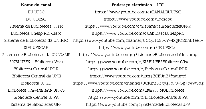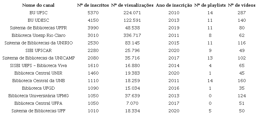 Desta forma, das 110 universidades listadas no E-mec, foram localizados 57 canais de bibliotecas, destacando que parte delas não utilizam plataforma de compartilhamento de vídeo. Apenas 14 bibliotecas possuíam mais de 1.000 inscritos, 10 federais e quatro estaduais. Os três maiores canais em números de inscritos estão na região Sul e são mantidos por sistemas de bibliotecas. Apenas três canais ultrapassaram a marca acima de 100.000 visualizações. Essas informações evidenciam um esforço por parte das bibliotecas na ampliação da comunicação e divulgação de seus serviços.