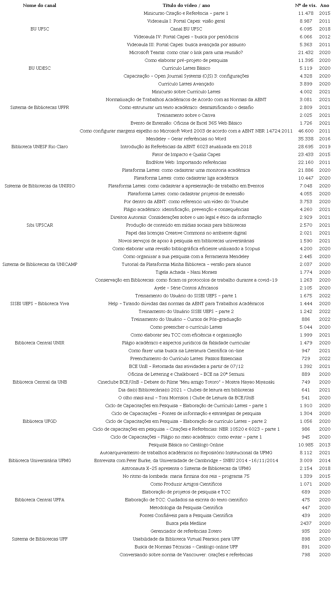 Abstract: It analyzes federal and state university libraries with regard to the development of new forms of interaction and communication with their communities, based on YouTube viewing metrics. It is characterized as an exploratory and descriptive research, with a mixed approach with the application of bibliographic and documentary research techniques. For the identification of Brazilian federal and state universities, the E-mec platform was used, in which the following filters were applied in the search: considering all federative units, selecting only federal and state public universities, totaling 110 universities. Based on the listed institutions, the websites of the universities were accessed and, subsequently, the tabs entitled Library and or Library System were located. In the libraries tab, information about social networks, tutorials and YouTube channel was located. When this information was not found, we searched directly on YouTube for the abbreviation of the university, associating it with library or library system. Thus, 57 library channels were located, the channels being delimited from 1,000 subscribers, leaving 14 of them linked to the 14 universities. University libraries in the south and southeast regions consolidate their practices and services in the channels, and the greater flow of publications and views in the channels corresponded to the period of social distancing, inferring that university libraries used the platform as a communication resource. The recurring themes in the 70 videos listed focus on the Lattes Curriculum, the standardization of academic works (citation, reference), the use of information sources and research in databases, the use of bibliographic managers (Mendeley, EndNote, Zotero), the construction of academic works, research design and scientific articles (writing), academic plagiarism, use of Canva, Excel, Open Journal Systems.