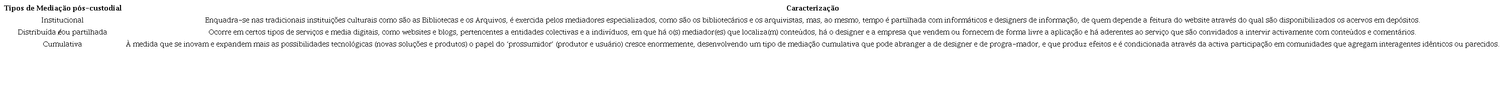 De acordo com os mesmos autores, o especialista em informação precisa acompanhar as iniciativas advindas com o avanço tecnológico, pensando nisto eles apresentam os tipos de mediação pós-custodial e informacional. No quadro 1 abaixo são apresentados os referidos tipos de mediação e sua respectiva caracterização.