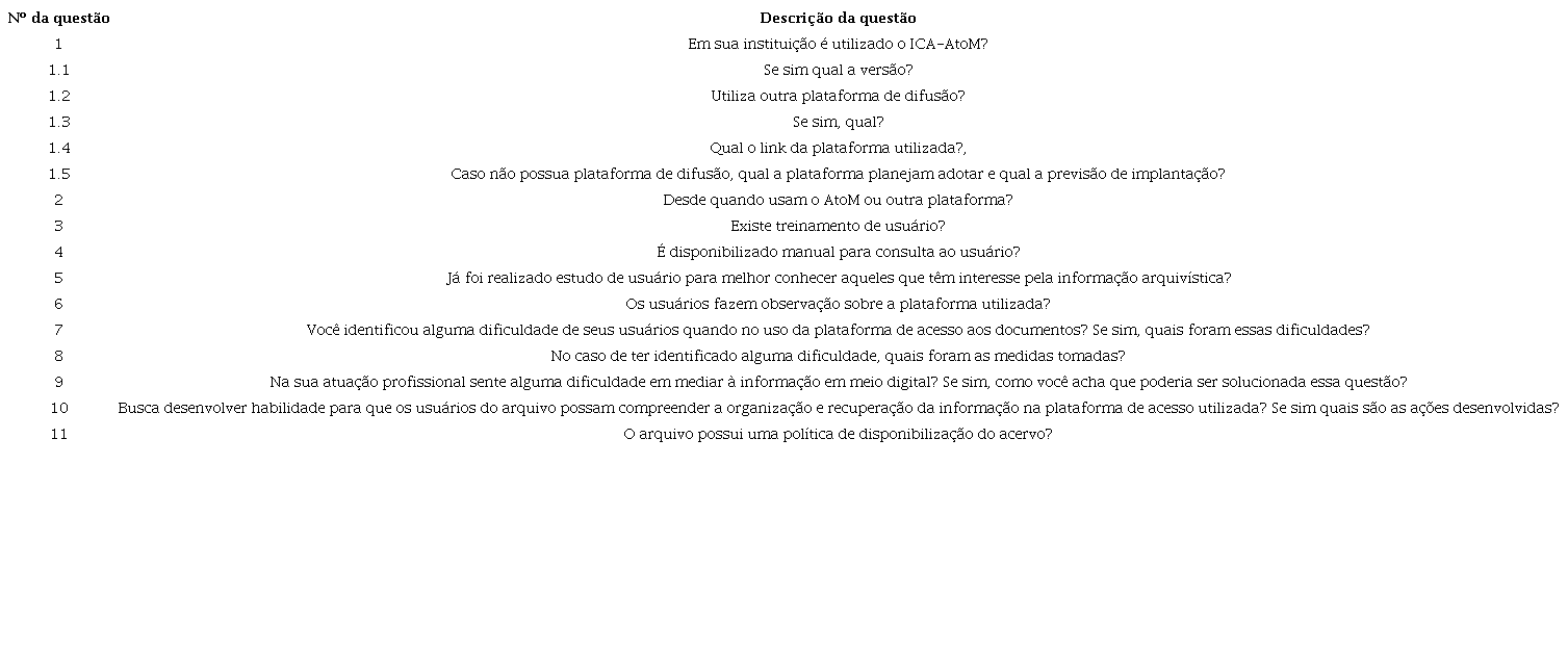 Baseando-se nas pesquisas referenciadas acima, buscou-se investigar o uso da plataforma de acesso e difusão AtoM, assim como as perspectivas dos usuários quanto ao uso dessa ferramenta. Dessa forma, foi elaborado e aplicado um questionário, com onze questões abertas, contendo subquestões, aos gestores do arquivo ou representantes com esta função nas IFES. As questões foram elencadas no Quadro 2, que será apresentado abaixo.