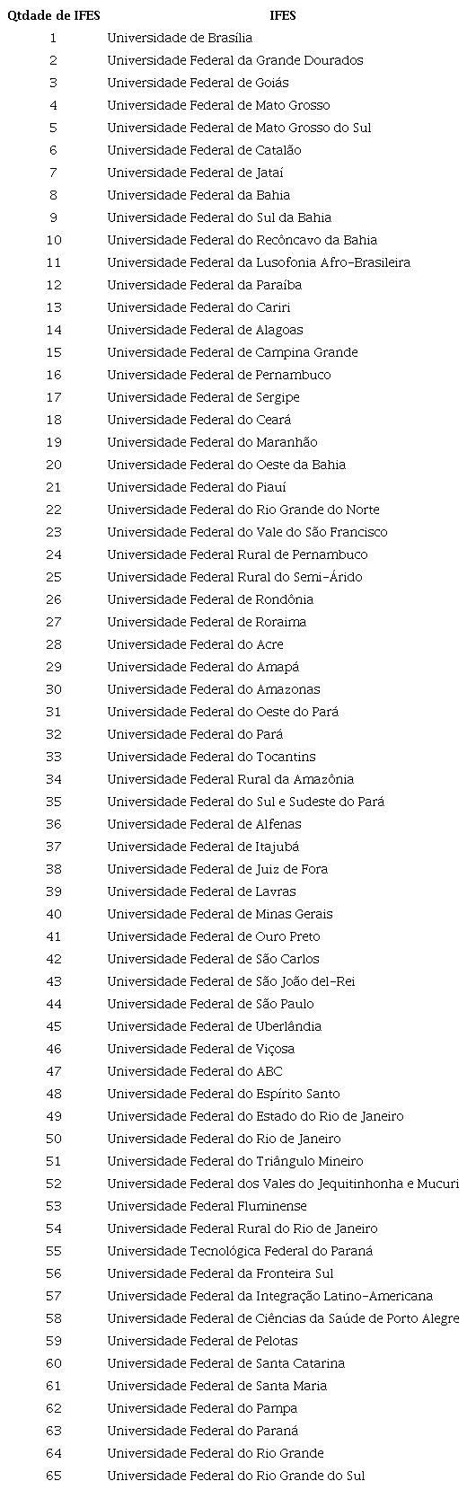 SALLIT, M. Universidades Federais: veja a lista de instituições por região do Brasil. Quero bolsas, São José dos Campos, 13 nov. 2019. Disponível em: https://querobolsa.com.br/revista/universidades-federais-veja-a-lista-de-instituicoes-por-regiao-do-brasil. Acesso em: 10 jun. de 2022.