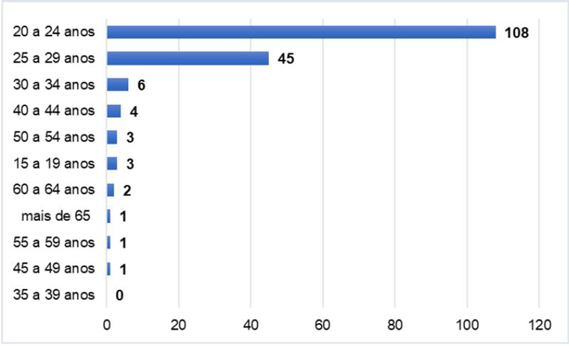 Há um número maior de mulheres (126; 70,4%) do que homens (51; 28,5%) entre os mediadores mexicanos que participaram de nosso estudo. Dois respondentes preferiram não responder. Há uma presença maior de jovens entre 20 e 24 anos (108; 60,3%) entre os respondentes, conforme ilustrado na Figura 1. A predominância de mediadores jovens nos museus e centros de ciência mexicanos é uma tendência também observada em outros estudos, que indicam a preferência dessas instituições em recrutar jovens universitários ( AGUILERA, 2017; MACÍAS-NESTOR; REYNOSO-HAYNES; TORREBLANCA-NAVARRO, 2020). Por outro lado, essa não parece ser uma preferência apenas das instituições do México, mas também dos demais países da região da América Latina e da Europa ( RICHARD, 2010; MASSARANI et al., 2021).